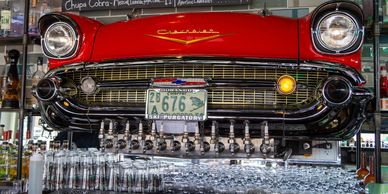 Toast your friends and family in a service station themed bar and enjoy a cold beer from the front end of a ’57 Chevy Bel Air, a sampling of our specialty craft cocktails, and our extensive lists of Mezcal and tequilas.